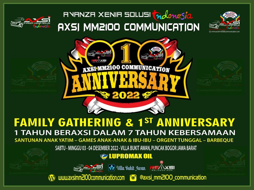 Dikarenakan sangat padatnya jadwal acara Hari Jadi dan kesibukan para member, untuk perayaan HUT AXSI MM2100 yang ke-1 th 2022, di adakan pada bulan Februari 2023 atas kesepakatan bersama dalam internal AXSI MM2100, kita adakan HUT tahun ini dengan penuh kesederhanaan, pada acara HUT kali ini kita adakan ceremony sederhana, di dalam event Family Gathering yang di isi oleh acara-acara sebagai berikut :